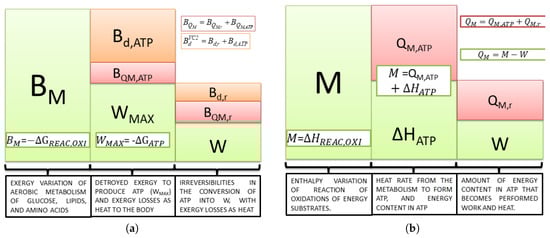 From these two figures, it is possible to conclude that if there is no performed power, all the energy released in metabolism becomes heat, as in Equation (7) (Figure 2b); however, from Equation (8), part of the exergy content in the nutrients is destroyed, and the remainder is released as exergy associated with heat (Figure 2a).
