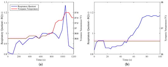 (a) Respiratory quotient and tympanic temperature of a subject under a bicycle test, (b) respiratory quotient of a subject performing a continuous biceps series with 4 kg (the internal temperature was considered constant, equal to 36.5 C.