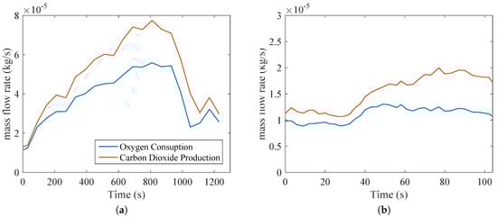 As in the work of Mady and Oliveira Junior [], there is a need to evaluate which compounds are degraded in human metabolism. Glucose was chosen as a representative of carbohydrates (Equation (9)), palmitic acid as a representative of lipids (Equation (10)) and an amino acid (with an average composition) to represent the proteins (Equation (11)). It is important to highlight that the amino acid does not suffer complete oxidation in the human body; moreover, this pseudo-molecule was proposed based only on compounds that exist in the human body. From these equations, it is interesting to define the RQ (respiratory quotient), which is the ratio of the carbon dioxide production to oxygen consumption (on a molar or volumetric basis). For Equation (9), this quantity is one; for Equation (10), it is 0.7; and for Equation (11), it is 0.83. This index gives a clue as to which nutrient is consumed in each activity or if it is a combination of these molecules.