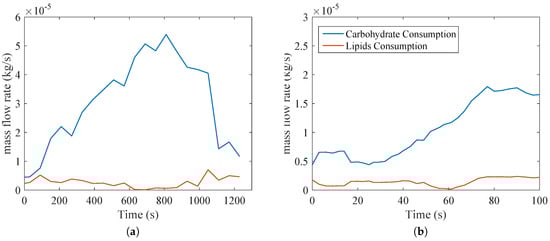 Note that Equations (16) and (18) represent metabolism on the basis of energy and exergy; therefore, the unit of the equations is Watts (W). The enthalpy and exergy variation of each nutrient (kJ/kg or J/g) multiplied by the mass consumption of these nutrients (kg/s or g/s) is calculated in Equations (12) to (14).