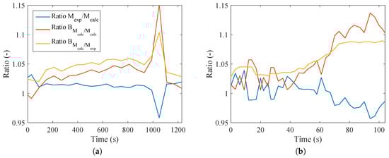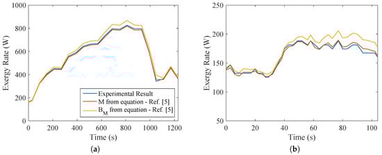 Figure 7a indicates that the ratio of the different methods to calculate metabolism was no larger than 5%. At only one point was there a difference of about 15%. This point is where a deceleration occurs and the subject continues to exercise, but with lower intensity (recovery period). In the case of Figure 7b, the trend was not as smooth, and comparing with Figure 3b, it is possible to conclude that higher values of the respiratory quotient resulted in higher ratios of metabolism on an energy and exergy basis. Therefore, for these cases, the assumption of is not valid. This result contradicts most of the literature in this area; nevertheless, this kind of test has not yet been performed, and further investigations should be done in order to better evaluate this behavior (since a divergence occurred at only one point).