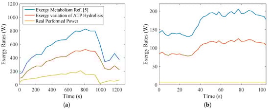 From the data collected, it was possible to evaluate the metabolic exergy, the maximum available work in ATP molecules and the real performed power. One conclusion with the comparison of Figure 8a,b is that the efficiency of aerobic exercise is higher than weight lifting. Nevertheless, this should be read carefully, because a larger amount of muscle area was used in Figure 8a, increasing the metabolic exergy and maximum available work in order to perform the required power. On the other hand, the increase in the total metabolism of the body for Figure 8b is very low due to the size of the biceps and the anaerobic nature of the activity. A lower performed power by the muscle in comparison to the overall metabolism of the body is expected, therefore justifying its lower exergy efficiency.