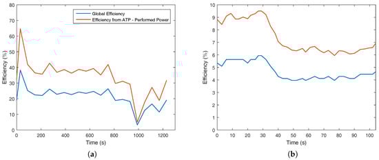 One other perspective that must be taken into account is how the body degrades the nutrient molecules, where a higher amount of aerobic metabolism leads to higher efficiency. A careful analysis of Figure 3b may indicate that when the RQ (respiratory quotient) has its magnitude larger than unity, there is the presence of anaerobic metabolism, which justifies lower efficiencies for Figure 8b than Figure 8a. These results may be evaluated using Figure 9, where the efficiency of Figure 9a is around three-times higher than the efficiency of the biceps test (Figure 9b).
