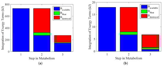 - The first column (1) indicates the maximum work that the body could extract from nutrients; therefore, the metabolic exergy (in blue). In order to obtain these values, the exergy metabolism was integrated over the period of time of the test. The value obtained in Figure 9a was 730 kJ. For Figure 9b, it was 18 kJ.