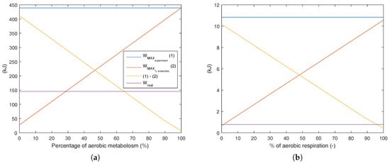When the respiratory quotient is higher than unity, it is supposed to have a higher percentage of anaerobic metabolism. Since it is not possible to properly define the amount of anaerobic metabolism only for calorimetry results, Figure 11 indicates all possible combinations of aerobic and anaerobic metabolism, and the results were integrated over time. To this aim, using each percentage of aerobic exercise as an input for the whole test, it is possible to evaluate which amount of anaerobic respiration is not possible, and therefore violates the second law of thermodynamics.