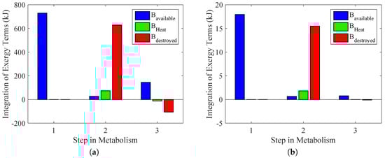 - Because the body only consumes ATP as a nutrient to perform any physical activity, there must be some irreversibilities in this step, as indicated in Column (2), using an integration of Equation (21). This result is in accordance with []. Nevertheless, there is a destroyed exergy in the process, in red (), and an exergy loss associated with heat, in green ().