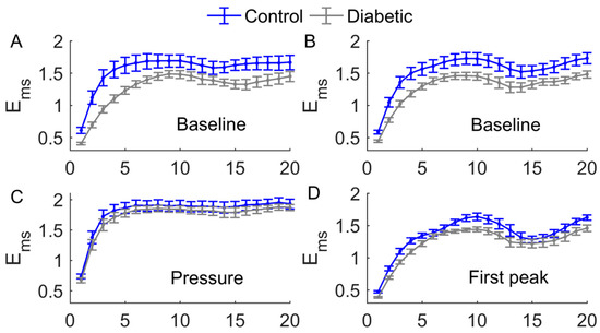 A common feature of the multiscale entropy, , was that it rose with increasing scales at small scales and then reached a plateau (Figure 6 and Figure 7). Applied pressure resulted in a significant increase in at all scales in diabetics (p < 0.01, Figure 6C) but not in controls (p > 0.05, Figure 6A). During reactive hyperemia, in diabetics showed little change compared to baseline (Figure 6C), whereas in controls it showed a significantly decrease at the scales = 3 to 7 and = 10 to 20 (Figure 6A). Compared to controls, in diabetics was significantly lower at the scales = 1 to 8 and = 14 to 16 during baseline (p < 0.05, Figure 7A,B), but was significantly higher at the scales = 13 to 18 during reactive hyperemia (p < 0.05, Figure 7E).