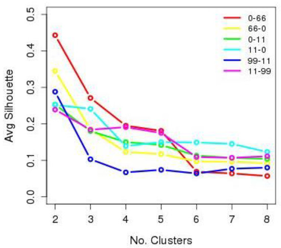 - Milligan, G.W.; Cooper, M.C. An Examination of Procedures for Determining the Number of Clusters in a Data Set. Psychometrika 1985, 50, 159–179. [Google Scholar] [CrossRef]