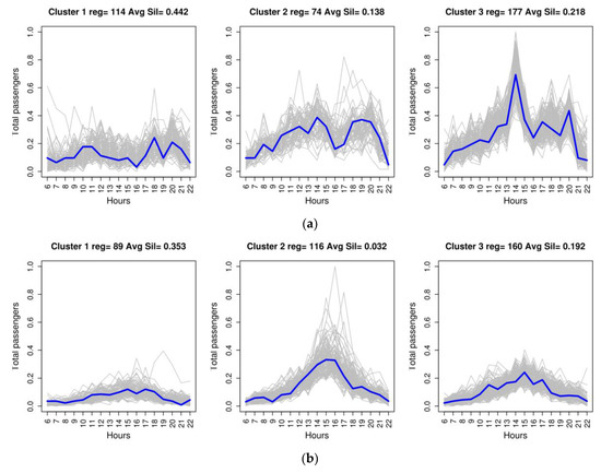 It can be seen in Figure 7a that, in the case of Trip 0–66, Cluster 3, which corresponds to the highest demand profile (Figure 4a) is concentrated mainly in 10 months of the year (January–June and September–December). These periods correspond to school periods in which the use of public transport to go to schools pushes up the number of public transport users. For this same route, Cluster 2, which is associated with an average demand profile, is concentrated in the months of July and August, a holiday period in which travel to school decreases. Cluster 1, which corresponds to the lowest demand profile, has a uniform distribution over every month of the year and is concentrated on days of lower working activity (Saturday and Sunday) (Figure 7b).