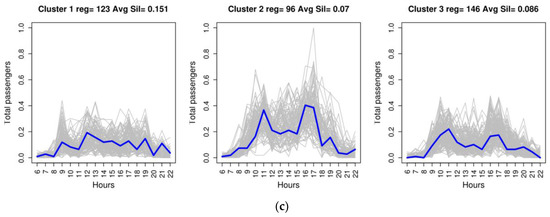 Clustering of three of the trips analysed. The horizontal axis represents the time of the day, from 6:00 a.m. to 10:00 p.m. The vertical axis represents the number of passengers, normalised. In the upper part of the graph for each cluster, the number of data records for that cluster and the consistency value of the cluster obtained with the silhouette function are indicated: (a) Clusters 1, 2 and 3 of Trip 0–66; (b) Clusters 1, 2 and 3 of Trip 0–11; and (c) Clusters 1, 2 and 3 of Trip 99–11.