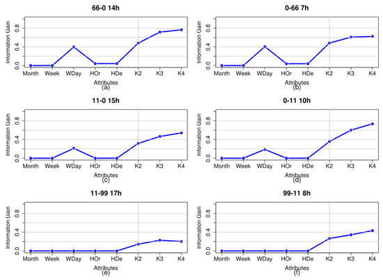 Figure 5 shows the entropy values obtained for the analysed trips and the values obtained for each of the hours of greatest passenger numbers on each of them: 2:00 p.m.–3:00 p.m. on Trip 66–0; 7:00 a.m.–8:00 a.m. on Trip 66–0; 3:00 p.m.–4:00 p.m. on Trip 11–0; 10:00 a.m.–11:00 a.m. on Trip 0–11; 5:00 p.m.–6:00 p.m. on Trip 11–99 and 8:00 a.m.–9:00 a.m. on Trip 99–11. The graphs show that the new generated attributes individually obtain a high information gain value in comparison with the classic time-dependent attributes used as reference.
