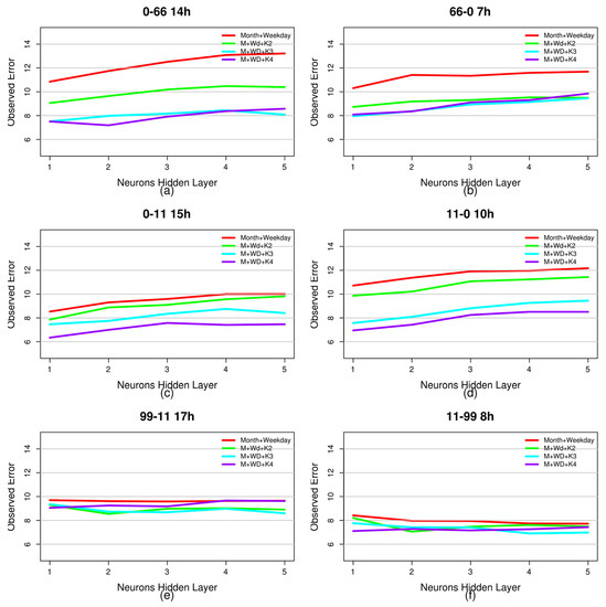 Observed error in the prediction of demand on each of the trips analysed in the peak periods of each one of them. The number of neurons in the hidden layer is represented on the horizontal axis. The vertical axis represents the observed error. At the top of each graph, the trip and peak time for which the prediction was made are indicated. (a) error on Trip 0–66; (b) error on Trip 66–0 ; (c) error on Trip 0–11; (d) error on Trip 11–0; (e) Error on Trip 99–11; (f) Error on Trip 11–99.