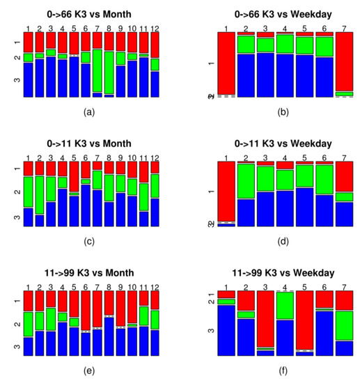 Graphic representation of the contingency table for the groupings of three clusters of three trips of the six that were analysed, according to the month of the year and the day of the week. The horizontal dimension is associated with a period of time (month in the tables on the left and day of the week in the tables on the right). The vertical dimension is associated with the clusters. (a) clusters of Trip 0–66 according to the month; (b) clusters of Trip 0–66 according to the day of the week; (c) clusters of Trip 0–11 according to the month; (d) clusters of Trip 0–11 according to the day of the week; (e) clusters of Trip 11–99 according to the month; (f) clusters of Trip 11–99 according to the day of the week.