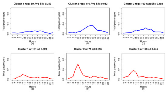 Medoids of three clusters of the two trips between stops 0 and 11. The medoids in blue are those obtained for the route between stop 0 and 11 and the medoids in red are those obtained for the route between stop 11 and 0. The horizontal axis represents the time of day, from 6:00 a.m. to 10:00 p.m. The vertical axis represents the number of passengers, normalised: (a) medoid of Cluster 1 on Trip 0–11; (b) medoid of Cluster 2 on Trip 0–11; (c) medoid of Cluster 3 on Trip 0–11; (d) medoid of Cluster 1 on Trip 11–0; (e) medoid of Cluster 2 on Trip 11–0; (f) medoid of Cluster 3 on Trip 11–0.