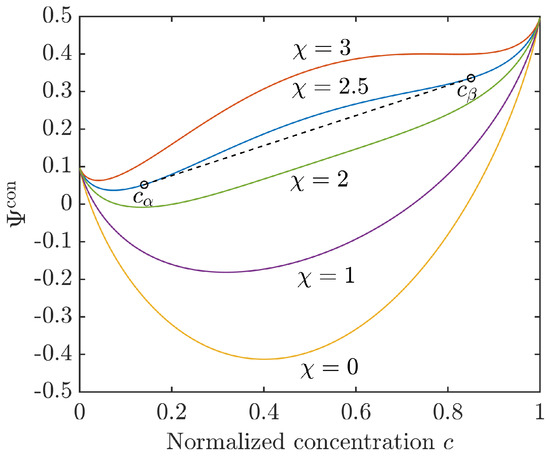 For a Flory–Huggins interaction parameter the mixing energy (12) is convex and corresponds to the energy of a homogeneous solution. Phase separation will be observed only for , when the configurational energy turns into a double-well function, i.e., it has two relative minima and a concave (spinodal) region in between. The concentrations and , i.e., the binodal points, can be determined by the common tangent rule, . The situation is illustrated for different values of in Figure 1.