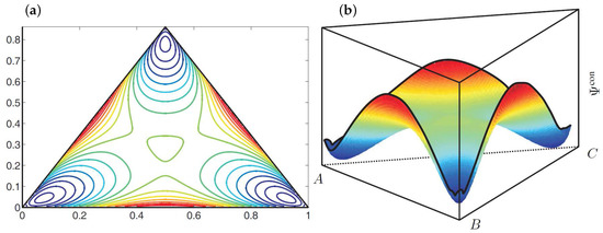 These material parameters represent a thermodynamically unstable mixture which will decompose into three equilibrium phases. The corresponding shape of the configurational energy within the Gibbs triangle is illustrated in Figure 2. Here the configurational energy has three local minima, which can be connected by a common tangent plane. The position of these minima characterizes the composition of the equilibrium phases.