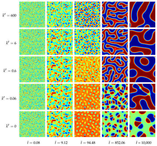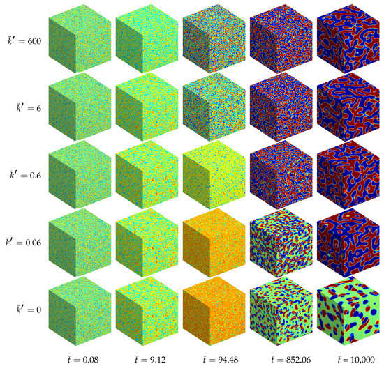 Additionally, a ternary reaction-diffusion system with the same material parameters as above has been simulated in a fully three-dimensional setting. The morphology evolution is displayed in Figure 5. The computed unit cube has periodic boundary conditions with no external flux, i.e., the initial state with , and is quenched in a thermodynamically unstable state. Therefore, the initially homogeneous mixture rearranges for all analyzed systems into chemical equilibrium at first. Next, separation into three equilibrium phases takes place where the final morphology, as well as the time till a stable decomposed state is reached, depend on the reaction rate, cf. Figure 4.