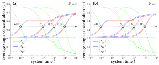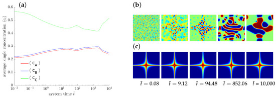 The corresponding distribution of is displayed in Figure 7c with red and blue indicating high and low values, respectively. The temporal evolution of the averaged concentrations indicates, that neither a chemical equilibrium nor a stable state is reached. The evolving microstructure is controlled by the rate of the chemical reactions.