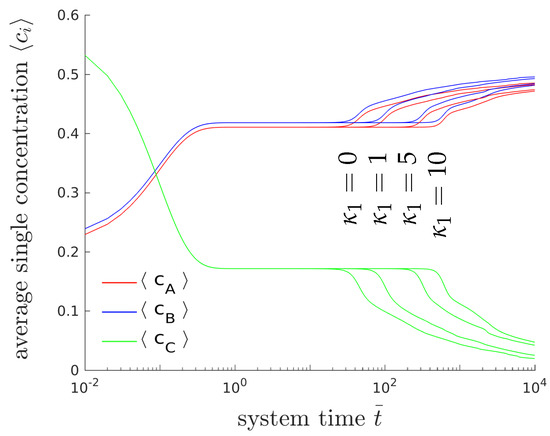 Temporal evolution of the averaged concentrations (blue), (red) and (green) of the chemical species A, B and C, for different values of gradient energy coefficient using .