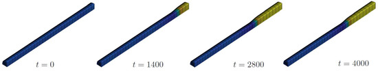 In a final example we simulate a rod with µm and µm each. The full rod is now meshed with finite elements. Note that there is a homeomorphism between the topological spaces of the rod and a cube and by a careful geometrical modelling of the NURBS based open-knot system we made sure, that there are no spurious concentration or stress effects at the edges of the descendant cube. In particular, the initial mesh configuration has been verified to be stress free.