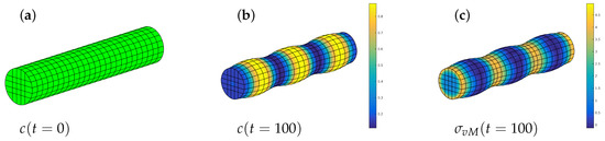 We choose an initial concentration of and let the system evolve in time. The initial state has a uniform concentration and a certain swelling which, of course, is homogeneous. The chemical reaction rate is and so we set . The result can be seen in Figure 9. Then the concentration changes toward the equilibrium phases and the phases decompose. As above, the stress-free equilibrium phases are and but the latter reduces as a consequence of the elastic field. The swelling changes accordingly and we get differently deformed regions of the rod, indicating high and low values of concentration. The elastic stresses are also displayed and we see that the maximum von Mises stress of about (yellow in Figure 9, left) is located at places with minimum concentration whereas at high values of the material is relaxed. Although a quantitative analysis would require reliable material parameters, this example illustrates nicely the interplay of elasticity and phase decomposition.