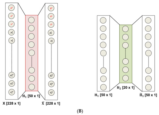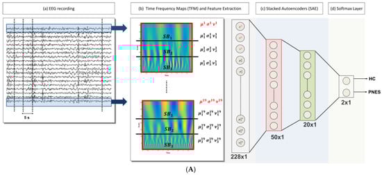 (A) The flowchart of the method: (a) The 19-channels electroencephalography (EEG) recording is partitioned into M = 20 non-overlapping epochs (of 5 s width), (b) given an epoch, the time frequency map (TFM) is estimated over each channel. The i-th TFM (i = 1, …, 19) is partitioned into three sub-bands ( j = 1, 2, 3); then, the mean (µ), standard deviation (σ), and skewness (ν) of the wavelet coefficients are evaluated for each SB and for the whole TFM. Once the TFMs are computed on the M = 20 epochs, a database of 20 × 12 × 19 data (#epochs × #features × #channels) is generated, (c) The vectors of 228 features are the input of a 2-stacked autoencoders (SAE) architecture. The last softmax layer performs the 2-way classification task (CNT-PNES); (B) The two Autoencodes (AE) implemented: the first AE compresses the 228 input features to 50 parameters (encoder stage) and then attempts to reconstruct the input (decoder stage); whereas, the second AE compresses the 50 features output of the first AE to 20 latent parameters. The compressed representations H1 (50 × 1) and H2 (20 × 1) (indicated in red and green, respectively) are used in the stacked autoencoders architecture.