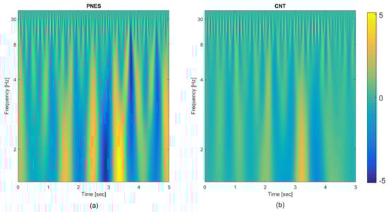 Time frequency representation of the psychogenic non-epileptic seizures (PNES) and healthy control (CNT). Each epoch of the 19-channels electroencephalography (EEG) is transformed in a time frequency map (TFM); then, the mean over the 19 channels, over the subjects and over the epochs is evaluated coming up with a single TFM per class. (a) TFM averaged over the 19 channels, the 20 epochs, and the six PNES subjects; (b) TFM averaged over 19 channels, the 20 epochs, and the 10 CNT subjects.