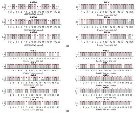 In Figure 3, the details of the classification performance of the proposed architecture are reported. Each bin of the representation refers to the output of the softmax layer obtained on each one of the 20 leave-one-out testing epochs; each sub-plot illustrates the results of the 20 leave-one-out testing sessions of the single subject. The height of each bin is the estimated output of the classification network obtained in the corresponding leave-one-out testing session (one correct classification; 0 misclassification). The two categories (PNES and CNT) are shown separately. The red dotted line is the mean output level of the network, averaged over the 20 testing sessions. The accuracy of the classification achieved by considering cumulatively the epochs referring to a single subject is 100%. To further validate the model, a fresh EEG from an additional PNES subject has been processed through the DL chain. 20 epochs of 5 s time signal have been extracted from the EEG recording and they have been correctly classified in 17 over 20 blocks, corresponding to a 85% accuracy.
