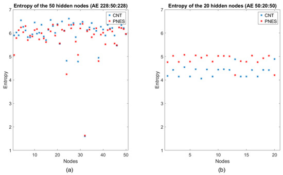 Entropy representation of PNES (red dots) and CNT (blue dots) evaluated at the outputs of the hidden nodes of the two compressed representations. (a) Entropy values related to PNES and CNT features extracted from the first AE (50 × 1). At this stage, the entropies of the two classes are comparable; (b) Entropy values related to PNES and CNT features extracted from the second AE (20 × 1). At this stage, the entropies decrease and they are different for the two classes and generally greater for PNES than CNT.