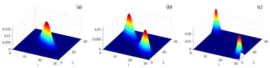 (Color online) Ground-state probabilities vs. i (left occupation number of species A) and j (left occupation number of species B) associated to space-mode Fock states of Equation (3) for boson numbers , and . (a) features localized populations for ; (b) partially localized populations for ; and (c) fully separated populations for . Energies in units of .