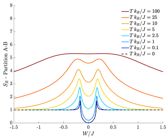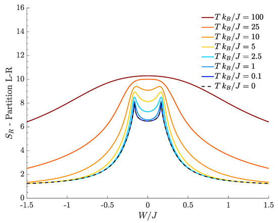 When the temperature is switched on, the DL phase transitions become less abrupt and the corresponding peaks in the plots are less sharp. However, as shown in Figure 5, still represents an effective indicator of the critical behavior in a non-small temperature range. As for the analyzed in Section 4.1, the residual-entropy plot at non-zero temperatures shows that for large enough. Once more, the limiting value (which all colored lines of Figure 5 converge to) highlights how the system features two equiprobable dominating configurations for large interactions. A non-vanishing T disturbs the formation of such configurations since, in the tails, for a given value of , the higher the temperature, the more differs from . As for the other partition schemes, for large T, tends to a maximum value, , where is the dimension of sub-system-B Hilbert space.