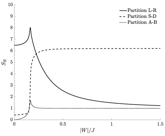 Residual entropies at as a function of for three different partitions of the Hilbert space: partition L-R (continuous line), partition S-D (dashed line), and partition A-B (dotted line). , , , .