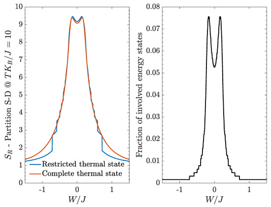 The effect of a finite temperature is to smooth the DL phase transitions, an effect that can be clearly appreciated observing the decreasing sharpness of the peaks as T is increased. Interestingly, all the tails of the plotted curves tend to the limiting value 1. For example, in the left tail (), this means that, in one has while all the other are vanishingly small. The resulting follows from the fact that there exist two dominating macroscopic configurations and whose correlation is mainly due to quantum entanglement for but assumes a more and more classical character for higher temperatures. In the case of the right tail (), the same effect is observed, but the dominating components are and . Note that, at fixed temperature, such configurations emerge provided that the interspecies interaction is strong enough to contrast the temperature-induced disorder. Of course, for a given value of , one has larger residual entropies at higher temperatures in that increasing T makes more and more energy eigenstates accessible in the thermal superposition ensuing from Formula Equation (7). We conclude by observing that, at high temperatures, in the central region around , approaches the limiting value because for all where (with , ) is the dimension of the Hilbert space. This limiting situation reflects the fact that, at high temperatures, (see Figure 2).
