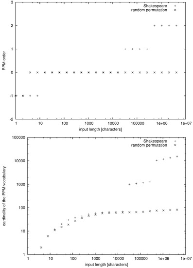 Now, we will define the PPM probabilities in a way that is closer to the conventions of paper [6,39] than to the conventions of Ref. [7]. In particular, in Equation (38), we consider frequencies of strings and in different strings, and , respectively, in the numerator and in the denominator to guarantee the proper normalization according to our definition of .