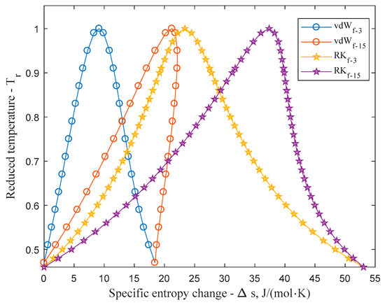 f = 15) degree of freedom. Calculations at low degree of freedom show that the entropy change influenced by the thermic equation is much less significant for vdW than for the RK equation. Since the second term of Equation (5) is relatively small for the vdW equation it also means that the third, caloric information dependent term will dominate the outcome of the entropy function. Since RK equation has a higher influence on entropy change however, it reduces the contribution of the caloric information to the entropy function, causing the RK equation to remain wet even at higher (