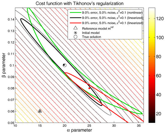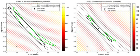 where represents the effect of the observational noise. The inverse problem consists of identifying the parameters from a set of data points that have been generated using as the true model. We have added two different levels of white noise to the observations ( and ), and the nonlinear parameter identification problem has been solved using the Gauss–Newton technique with as the initial guess.