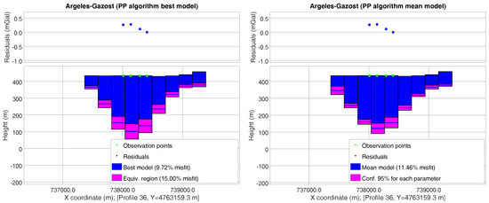 The first approach consisted of establishing a minimum–maximum range for each parameter, taking into account the geophysical models that have been sampled within the nonlinear uncertainty region. Figure 4 (left) shows a West–East profile (that which includes the deepest point, where the profile number corresponds to the I prism index in Figure 3, right lower) of the Argelès-Gazost basin. It can be observed that the best PSO model had a misfit of ; the deepest point reached a depth from the surface of about , and it belonged to a range of 288–379 m.