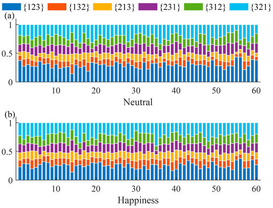 The value of permutation entropy is based on the distribution of ordinal patterns. The distribution of ordinal patterns during the six emotional states was observed. The distribution of ordinal patterns with D = 3 and τ = 1 of the neutral and happiness emotional states of 60 subjects are shown in Figure 2. Similar results were obtained for the other emotional states. We found that patterns {123} and {321}, {132} and {213}, {231} and {312}, respectively, had similar frequency percentages as Graff et al.’s study [28]. Subtle changes in the distribution of the ordinal patterns could reflect on the value of PE, and also on PME.