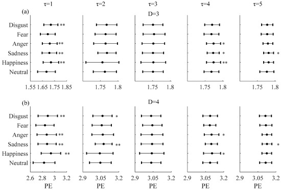 Mean and SD of permutation entropy (PE) with (a) D = 3, (b) D = 4 and embedding delays τ between 1 and 5 of the RRI time series during six emotional states. ** mean P < 0.01. * mean P < 0.05.