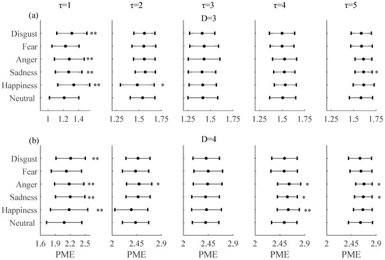 Mean and SD of PE and PME for males and females with (a) D = 3, τ = 1 and (b) D = 4, τ = 1 under the six emotional states. ** mean P < 0.01.* mean P < 0.05.