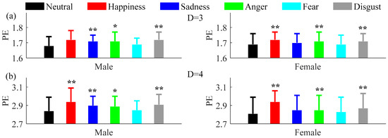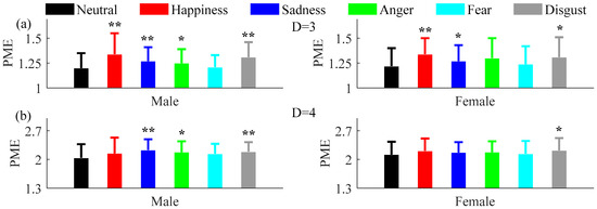 Since the number of females and males enrolled in this research were the same, possible differences due to gender were tested. As shown in Figure 7 and Figure 8, the results show that compared with the neutral emotional state, both PE and PME increased in all five non-neutral emotional states when embedding dimension D = 3 and D = 4.
