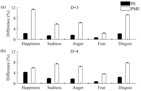 To analyze which of the two symbolic entropies is more sensitive for discriminating emotional states, Figure 9 shows the relative increment associated with the PE and PME for the non-neutral emotional states compared to the neutral emotion state with both embedding dimensions (D = 3 and D = 4). We observed that the relative increments of the PME are larger than those obtained for the PE for all non-neutral emotional states for the two values of D. Thus, PME seems to be more sensitive than PE for characterizing emotional states.