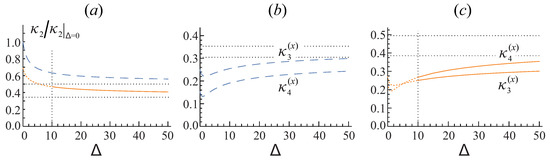 First, let us elaborate, by means of the analytical result in Equations (27) and (28), on the values of the cumulants and their dependence on the interaction strength parameter (see Equation (13)) for the case of the cubic box traps, .