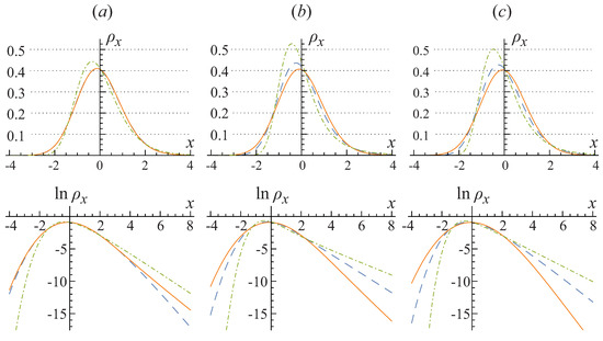 We start with some general properties of the probability density function or its scaled counterpart , (27), described by the basic model (10)–(12), common for all three-dimensional cubic or rectangular box traps, no matter what are the boundary conditions. The leading term of the asymptotics of the characteristic function at the large values of the argument is given by a power law as could be shown in the same way as it was done in [27,28] for the case of an ideal gas. It means that the actual distribution is described by an exponential slope for the positive arguments x, i.e., for , and by much steeper, super-exponential slope for the negative arguments x, i.e., for . The form of both wings of the probability distribution is quite different from the Gaussian law.