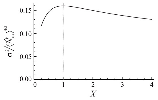 The result in the Equation (33) explicitly proves that the fluctuations of the condensate depletion in the weakly interacting gas are anomalously large compared to the standard thermodynamic fluctuations. The thermodynamic fluctuations would have considerably smaller variance, , proportional only to the first power of the mean value, while the variance (33) of the true noncondensate occupation is proportional to the larger power, , of the mean noncondensate occupation . Thus, the basic model (10)–(12) is in agreement with this known fact [14,15,18].