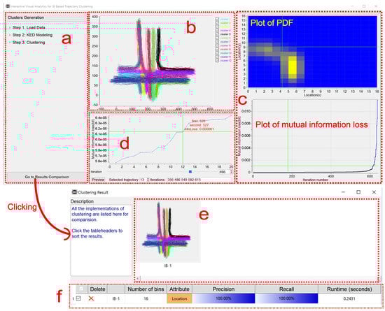 In general, to show the performance of a clustering algorithm, only the final clusters and their corresponding quantitative evaluations are presented. Obviously, simply checking and analyzing the results from performing IB-based clustering on different trajectory datasets help demonstrate the effectiveness of IB, but this gives little insight to thoroughly understanding the mechanism of IB on how to work on trajectory data. To deal with this issue, we take advantage of the visual analytics methodology, which has attracted increasing attention in the field of trajectory analysis []. A lot of visual analytics approaches related to trajectory analysis have been proposed [,], although most of them solely involve the visualization of trajectory attributes and analysis results. In this case, it is not easy for users to understand the algorithmic procedure of the analysis method.
