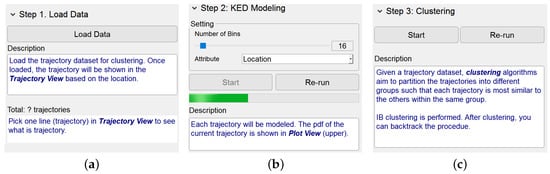 Interface of Dashboard View. (a–c) show the design and description of three panels, “Load Data”, “KDE Modeling” and “Clustering”, respectively. (a) Panel of step 1; (b) Panel of step 2; (c) Panel of step 3.