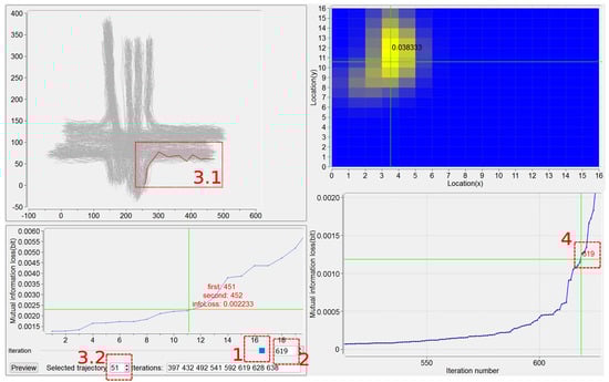 Users can be moved to a certain iteration based on one of the following four kinds of interactions, described as follows. First, the use of the slider (see region 1 in Figure 5) is straightforward, but somewhat arbitrary. Second, the iteration number can be input directly in the textbox (see region 2 in Figure 5). Third, a trajectory is specified either by picking it up in Trajectory View (see region 3.1 in Figure 5) or by filling in its ID number (see region 3.2 in Figure 5), and the relevant iterations in which this trajectory is involved for being merged are identified. For example, the trajectory with is specified and the numbers of its relevant iterations, , are recognized (Figure 5). Notice that in this case, if a specified trajectory is found being incorrectly clustered, then the iteration in which a wrong merging of clusters happens can be easily located. Here the PDF of the specified trajectory is also displayed in Plot View, as a “highlight” on this trajectory. Fourth, an iteration can be addressed by clicking on the plot of the least mutual information loss (see region 4 in Figure 5). Note that, given a certain iteration, all the information corresponding to the four kinds of interactions mentioned above is synchronized.