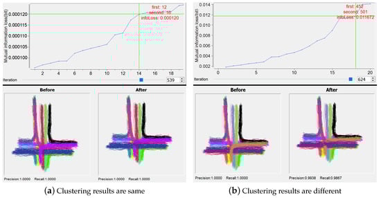 Our focus is, based on IBVis, to probe the behavior of IB clustering in each iteration, attempting to gain insight to improve IB. Here, as for the parameters used by KDE modeling, we set the number of bins as 32 and utilize the location attribute as suggested by the designers []. In practical applications of IB clustering, the execution efficiency and quality of clustering are important for the sake of handling complex trajectory dataset, and the use of IBVis helps to solve these issues. Generally, in each merging iteration, only two candidate trajectory clusters are combined. However, more than two candidates could be merged to speed up the clustering process. An example of the utilization of IBVis, shown in Figure 6a, indicates that the 14th pair of clusters (the clusters numbers 12 and 16) are interactively and manually merged by using the view “Merging and Backtracking”, for the 539th iteration, to obtain the same final clustering results due to the direct performing of the original IB algorithm. Moreover, the first pair of clusters (the clusters numbers 616 and 627), which are taken for merging by the original IB, in the end fall into the clustering group also containing the 14th pair of clusters. This implies that more than one pairs of clusters in an iteration could be merged, decreasing the computational burden of the IB clustering process, as has been discovered in our previous work []. For another example of using IBVis, as illustrated in Figure 6b, the interactive analytics methodology provided by “Merging and Backtracking” reveals that, by the merging of the 18th pair of clusters (the clusters numbers 452 and 501) for the iteration number 624, the final clustering performance is reduced to 0.9938 and 0.9867 for precision and recall measures respectively, which are all lower than 100 percent achieved by the original IB. This clearly points out that the quality control on the selection of the pair of clusters for merging is important. In addition, this also hints that one of the possible ways for the improvement of IB-based clustering is to make use of a term relevant to the clustering quality in the objective function of IB principle.