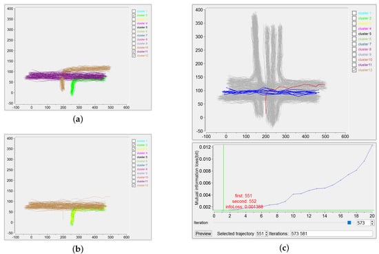 The use of “Merging and Backtracking” also helps, in the procedure of IB clustering, to debug a possible clustering error due to the outliers in the trajectory dataset. It is widely known that outliers make the clustering difficult and usually outlier detection is done before the clustering []. Indeed, the use of effective distance metrics, such as robust Mahalanobis distance [], could probably help to detect outliers in trajectory data. In this paper, we attempt an alternative way, namely the visualization methodology, for this issue, as described in the following example. Considering the trajectories covered by the “ground-truth” clusters 2, 11 and 12 in Figure 7a, only one trajectory of the cluster 12 is kept as an outlier (the red one in upper part of Figure 7c), and the IB clustering is performed to output the results shown in Figure 7b. The outlier and the trajectories belonging to the previous cluster 11 are incorrectly grouped to give the (new) cluster 12. Besides, the original cluster 2 is wrongly divided into the (new) clusters 2 and 3. The precision and recall for this unsatisfactory clustering are 99.60% and 91.67%, respectively, which can be obtained by checking the corresponding interface. Here, by simply picking up the outlier trajectory in Trajectory View (as illustrated by the region 3.1 in Figure 5), the ID of this trajectory (number 551) and also the iterations take this outlier for merging are all easily identified on the interface. Obviously, with the participation of users, the iteration number 573, in which the outlier is firstly included for merging, can be tracked, as demonstrated in the lower part of Figure 7c. Then users can manually choose another suitable pair of clusters for merging for this iteration, finally leading to a correct clustering result. The manageable handling of outliers for IB-based clustering offered by IBVis implies that outlier detection can be done explicitly in the procedure of clustering, this can be fulfilled by adding an item on quality control and/or by directly carrying out outlier detection in each iteration, as have been proposed in our former papers [,].
